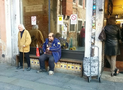 The couple looks to be older, very chic local Venetians out for some shopping and sipping some prosecco before getting to their chores, I guess. She was wearing wonderful orange pants, loafers and socks.